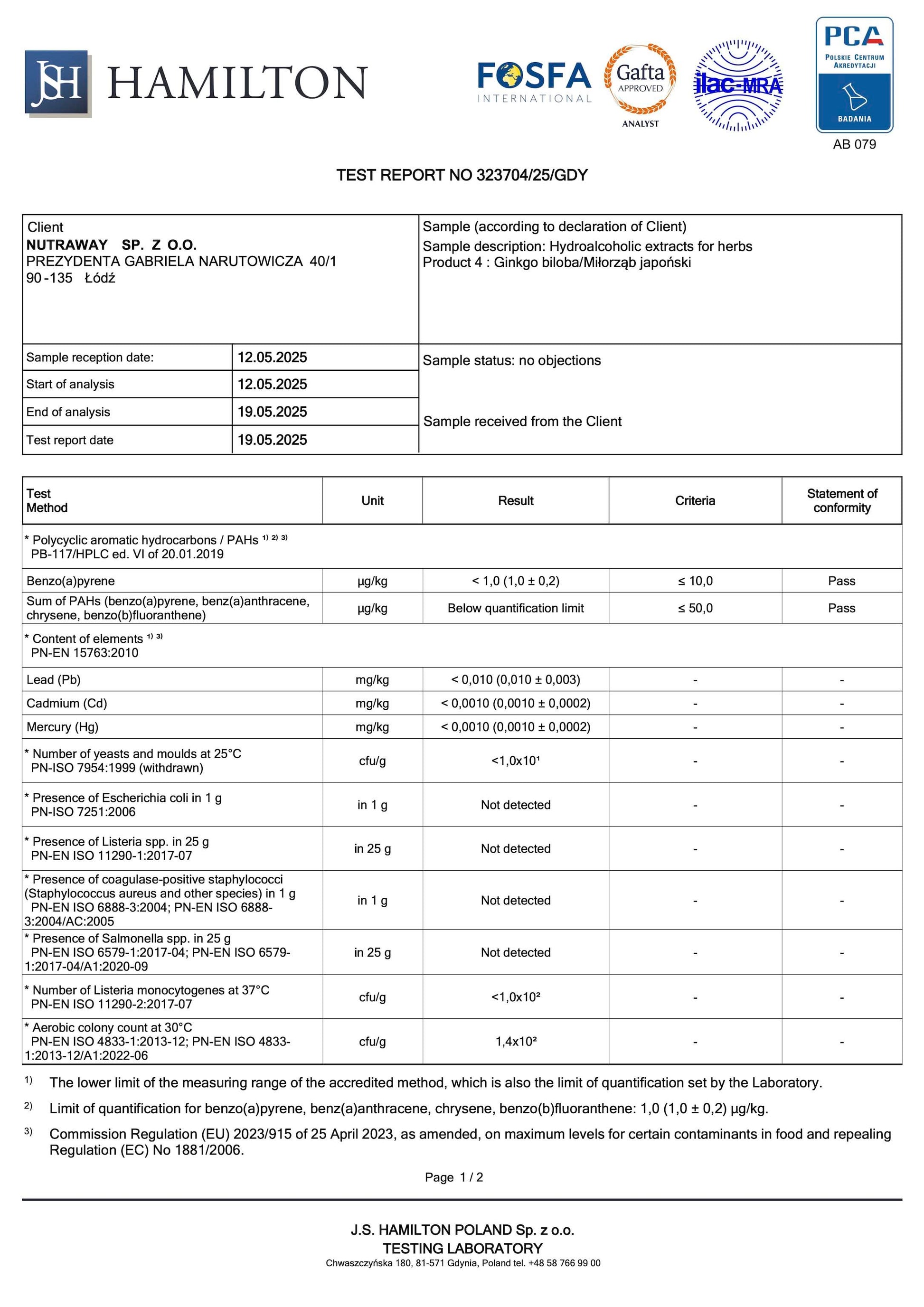 Forschung durchgeführt von J.S. Hamilton Poland Sp. z o.o. im Auftrag von Nutraway Sp. z o.o., dem Eigentümer der Privatmarke Ollywell. Proben von flüssigem Ginkgo-Biloba-Extrakt wurden getestet. Die Studie wurde nach einer akkreditierten Methode durchgeführt, und die Ergebnisse gelten nur für die erhaltenen Proben. Alle im Bericht dargestellten Ergebnisse liegen unter den höchsten zulässigen Kontaminantenwerten gemäß der Kommissionsverordnung (EG) Nr. 1881/2006 vom 19. Dezember 2006. Dies bedeutet, dass der flüssige Extrakt von Ginkgo Biloba sicher für den Verzehr ist.